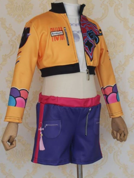 Tip produs: Costum cosplay anime pentru copii (stil Rumi) Culoare: Galben – Mov – Roz, cu detalii estetice KPop Compoziție: Poliester de înaltă calitate Setul include: Jachetă Tricou Pantaloni scurți (peruca NU este inclusă) Croială: Linie lejeră cu talie elastică pentru libertate de mișcare Întreținere: Spălare manuală cu apă rece sau program delicat.